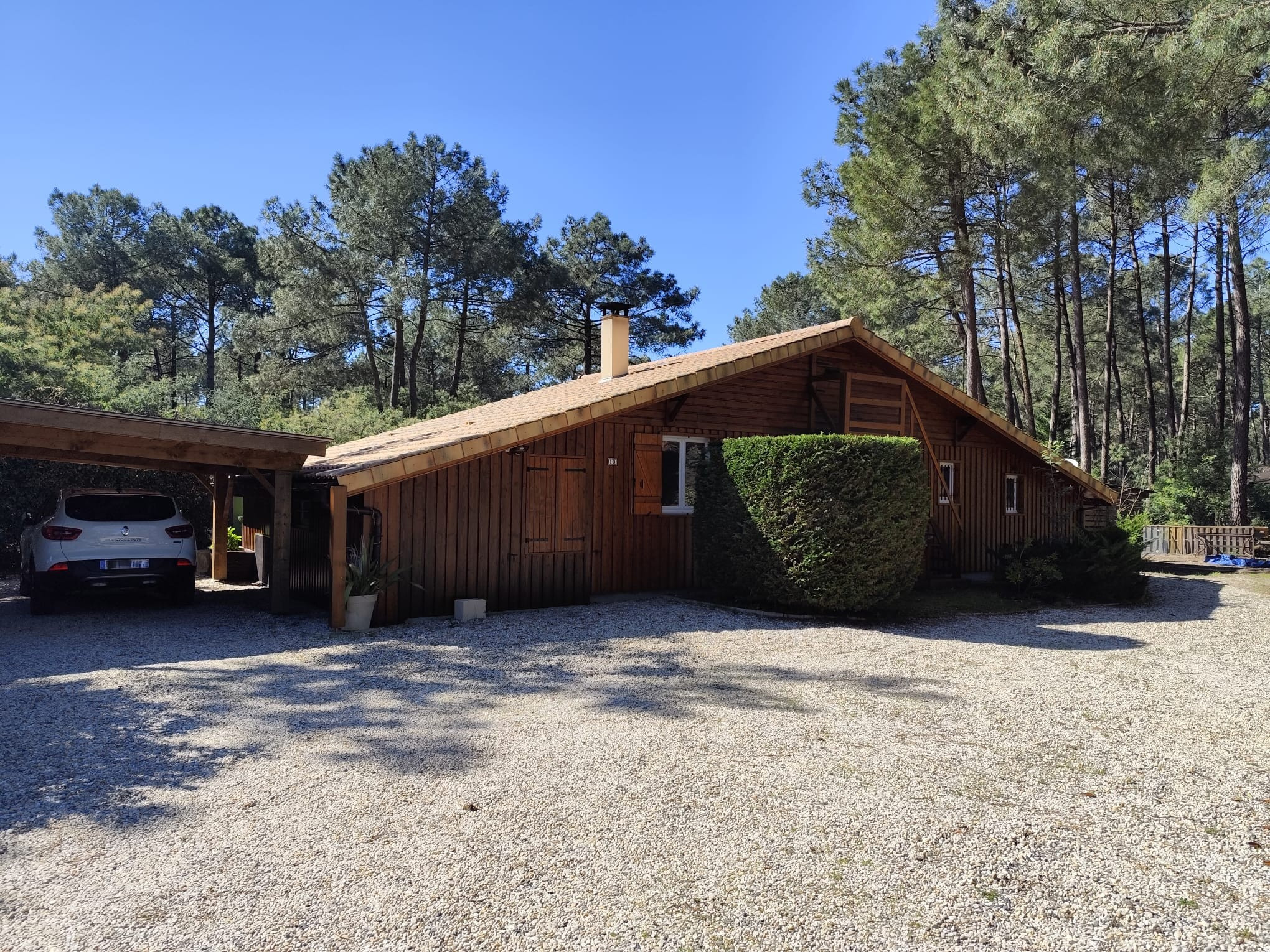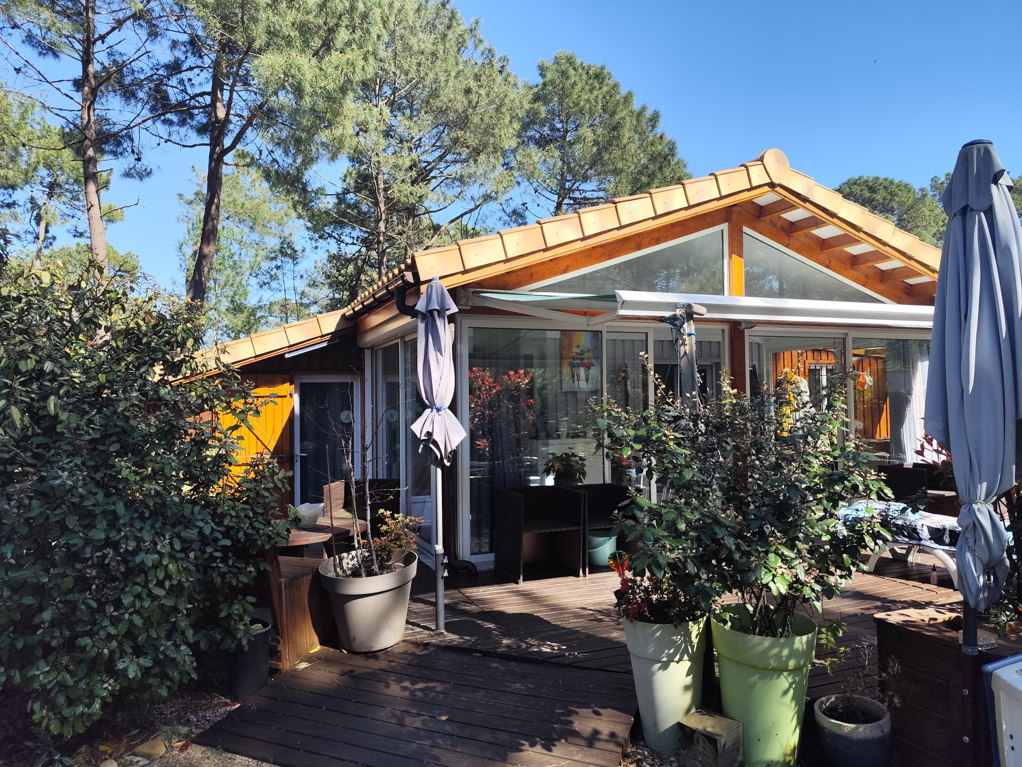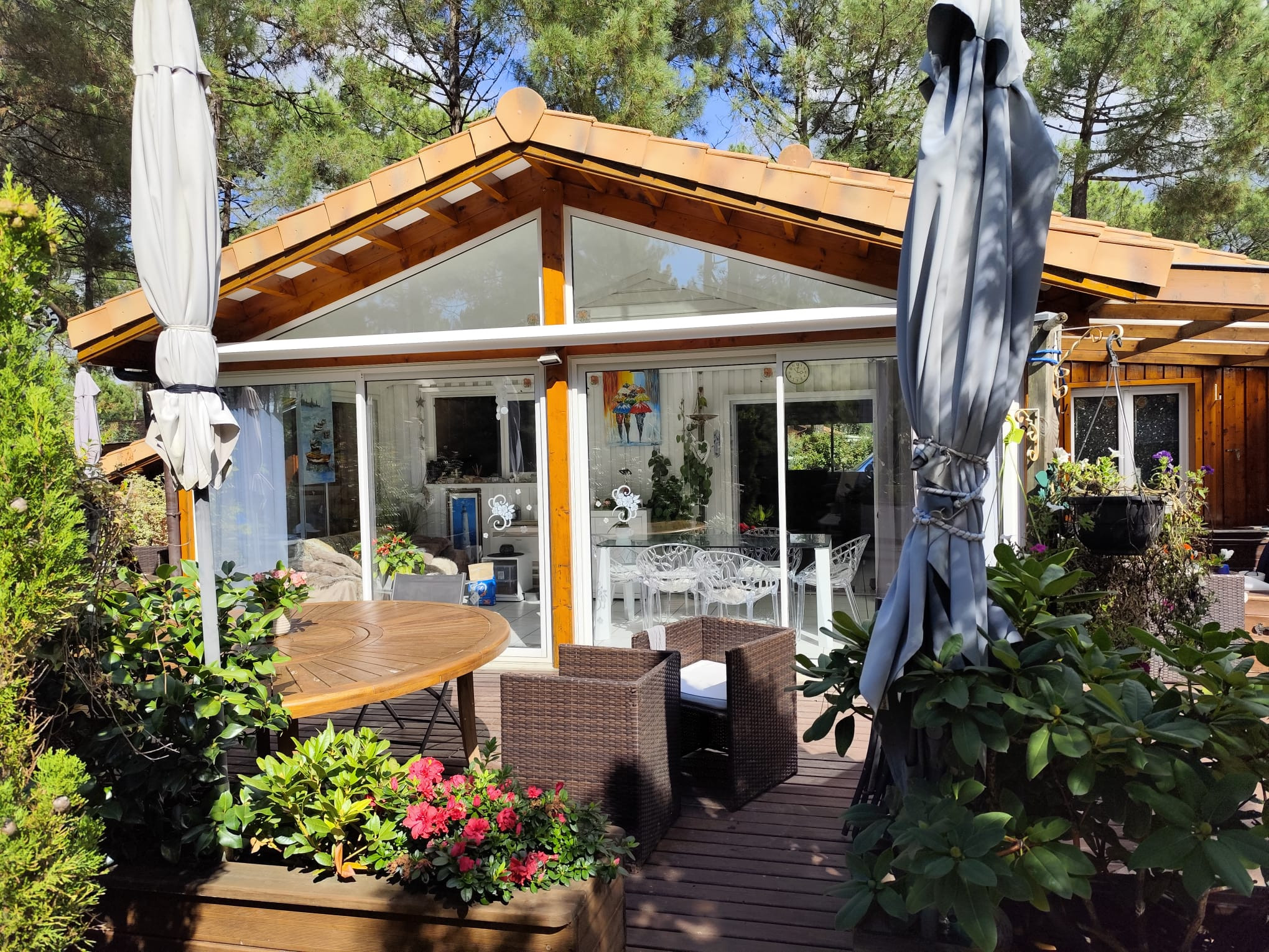 Im Freien wartet ein Grundstück von 500 m², ausgestattet mit Gartenmobiliar, einer Terrasse, einem sehr großen elektrischen Markisenzelt und einer warmen Außendusche. Zwei überdachte Parkplätze sind in der Nähe des Gebäudes, unter dem großen Carport, verfügbar und erleichtern das Parken. Außenwasserhähne und Beleuchtung rund um die Unterkunft ergänzen die großzügige Ausstattung dieses Chalets.