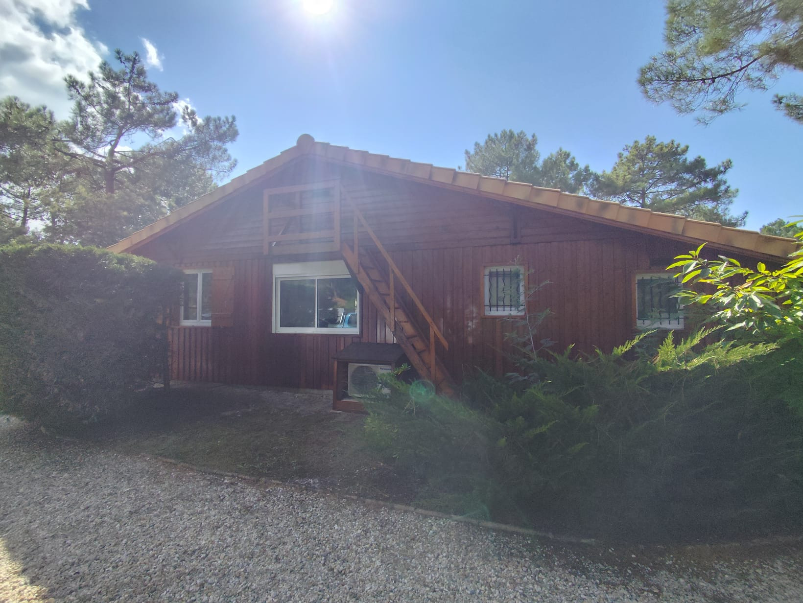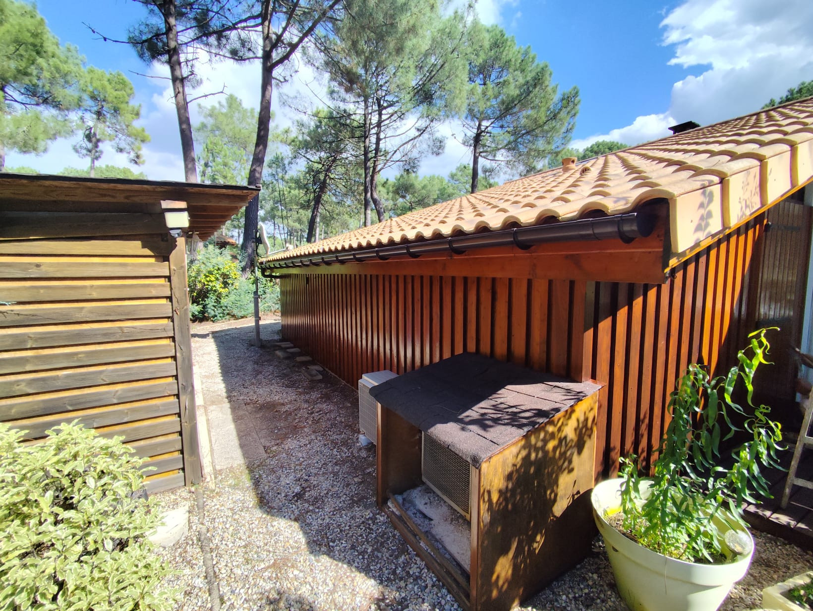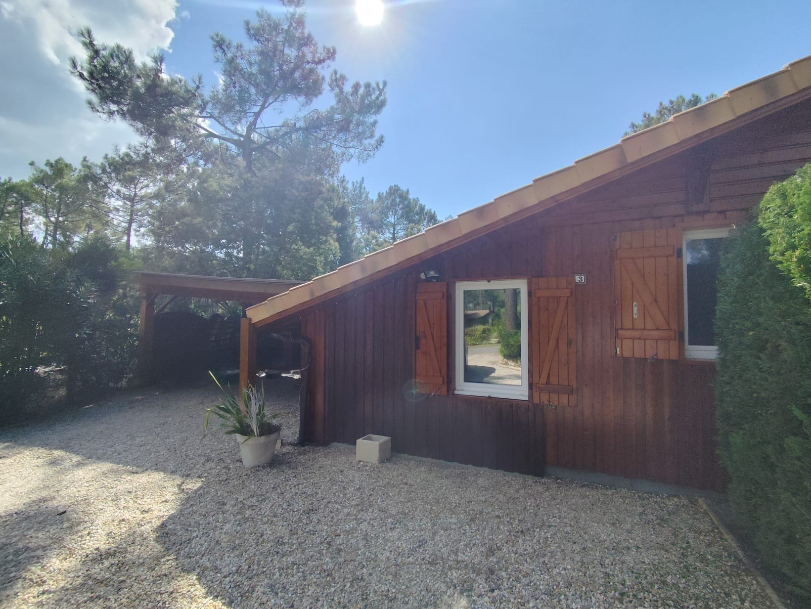Im Freien wartet ein Grundstück von 500 m², ausgestattet mit Gartenmobiliar, einer Terrasse, einem sehr großen elektrischen Markisenzelt und einer warmen Außendusche. Zwei überdachte Parkplätze sind in der Nähe des Gebäudes, unter dem großen Carport, verfügbar und erleichtern das Parken. Außenwasserhähne und Beleuchtung rund um die Unterkunft ergänzen die großzügige Ausstattung dieses Chalets.