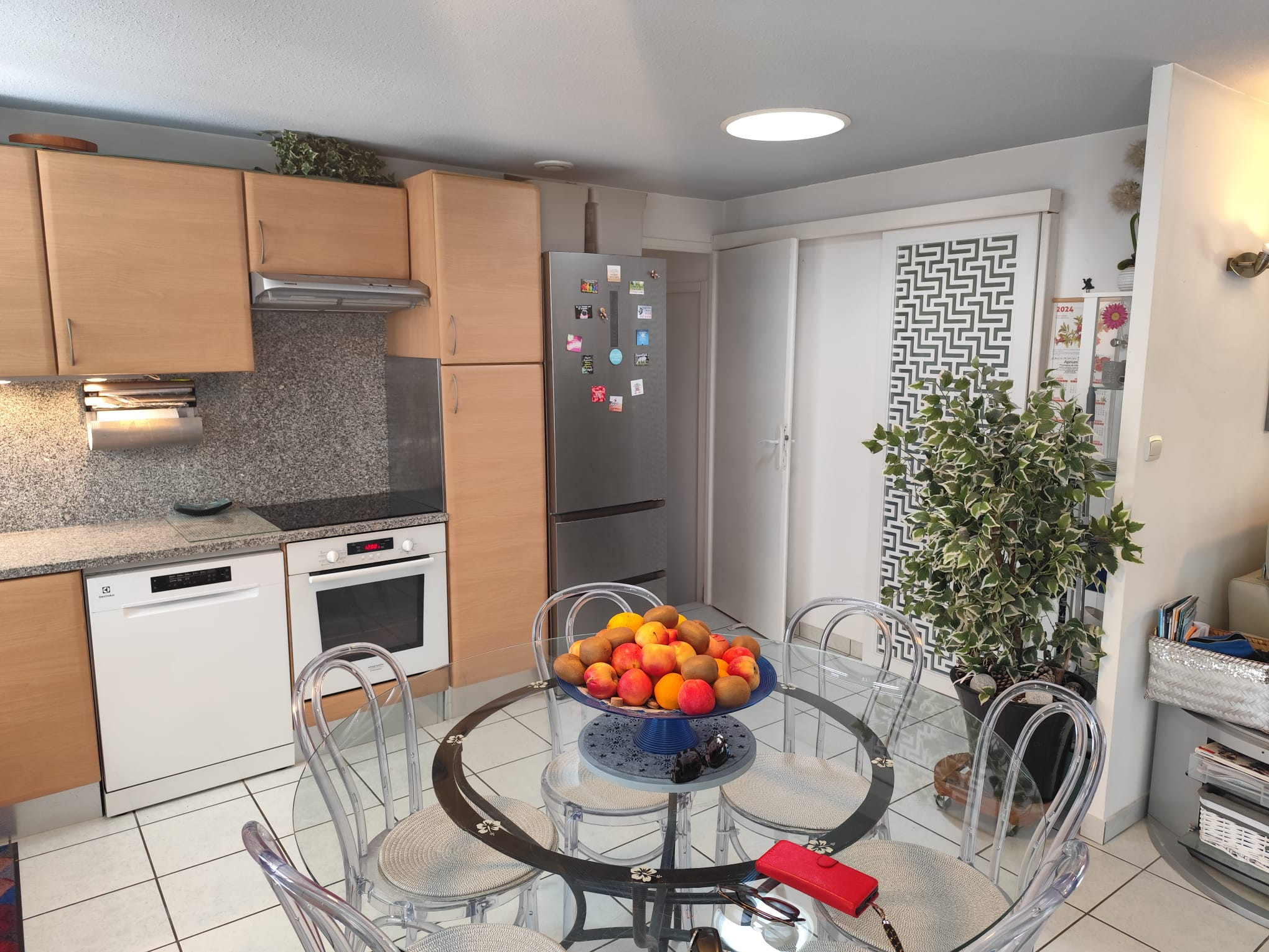 Die amerikanische Eckküche mit Rückwand und Arbeitsplatte aus Granit, Induktionskochfeld mit 3 Kochzonen, ist komplett ausgestattet und bietet allen Komfort, um Familienmahlzeiten zuzubereiten. Sie umfasst einen Kühl-Gefrier-Kombischrank, einen Kühlschrank mit Gefrierfach, einen Backofen, eine Dunstabzugshaube, eine Spülmaschine und eine Mikrowelle.
