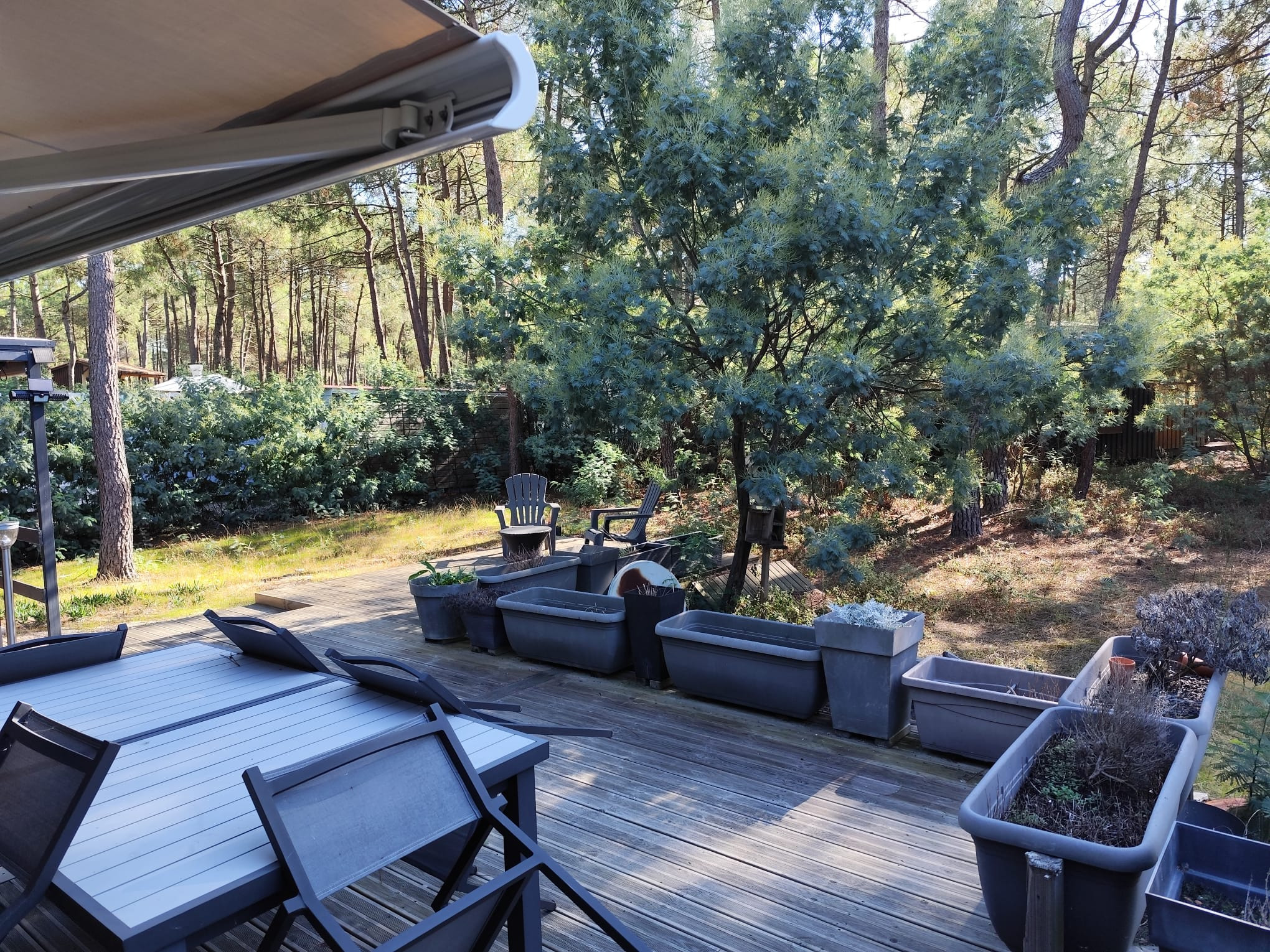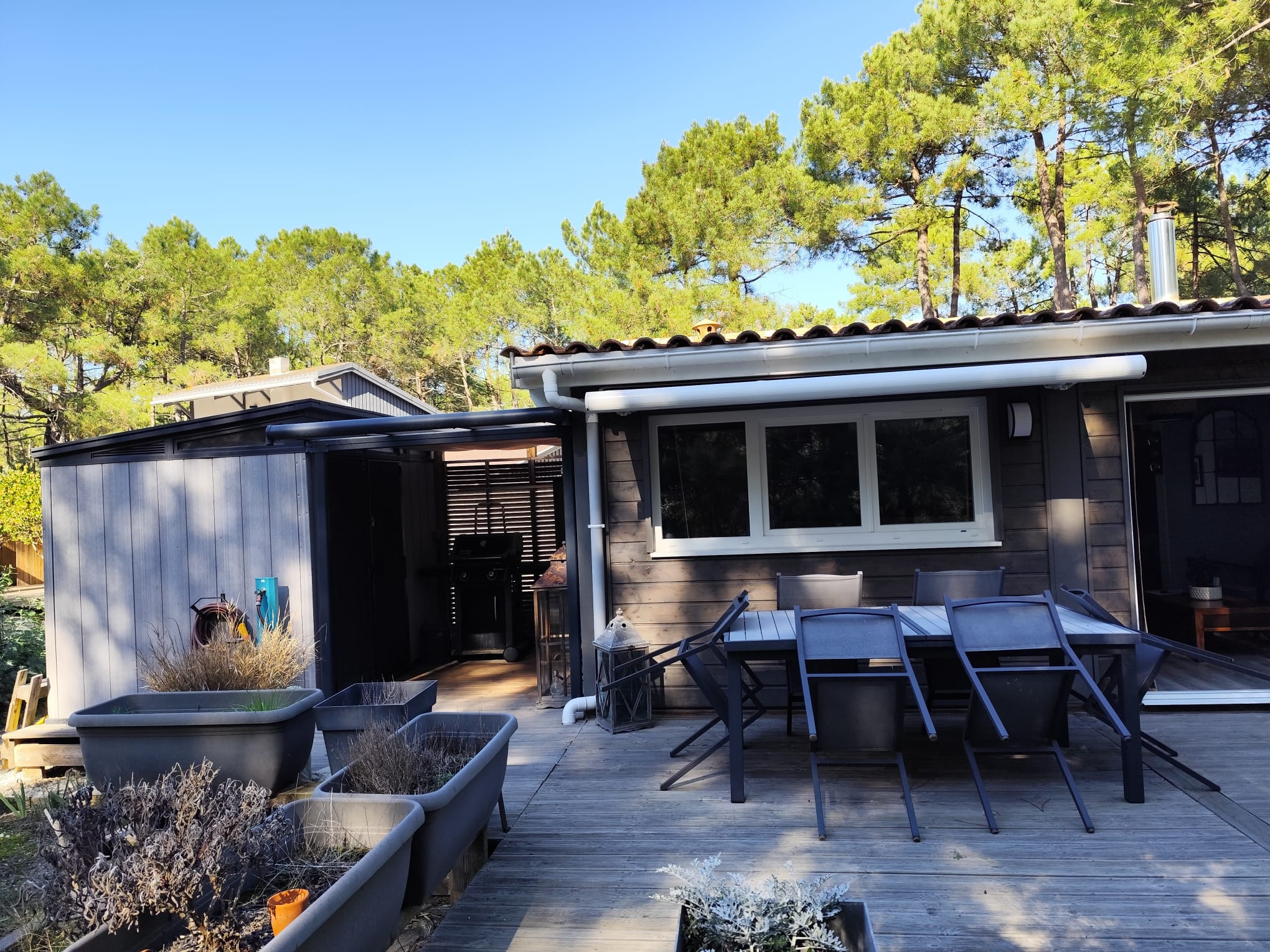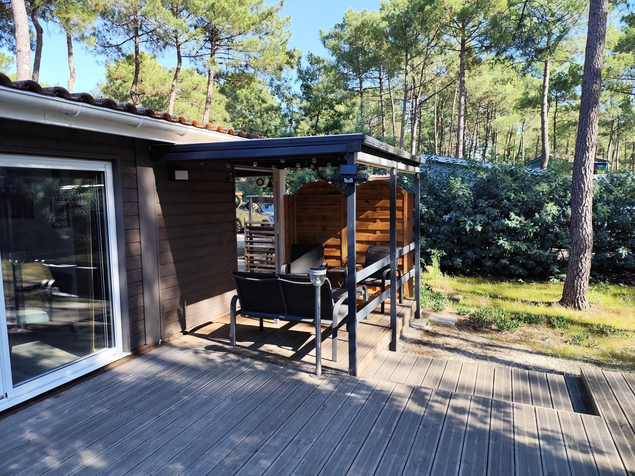 Die nach Süden ausgerichtete Holzterrasse bietet mehrere Möglichkeiten zum Wohlfühlen, in Sonne oder Schatten. Ein Gartenhaus mit zusätzlichen Kühlschränken, Regalen und einem Weinregal komplettiert das Ensemble.