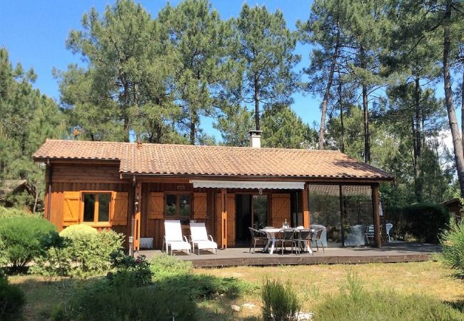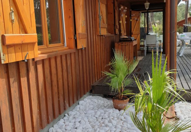 Ein sehr schönes und gepflegtes Sommerhaus des Typs Aquitaine mit zwei Schlafzimmern (2 Doppelbetten à 140x200). Gute Lage, mit einem sehr schönen Wintergarten mit Glasfront und Sicht auf den Pinienwald.Glasfaser.
