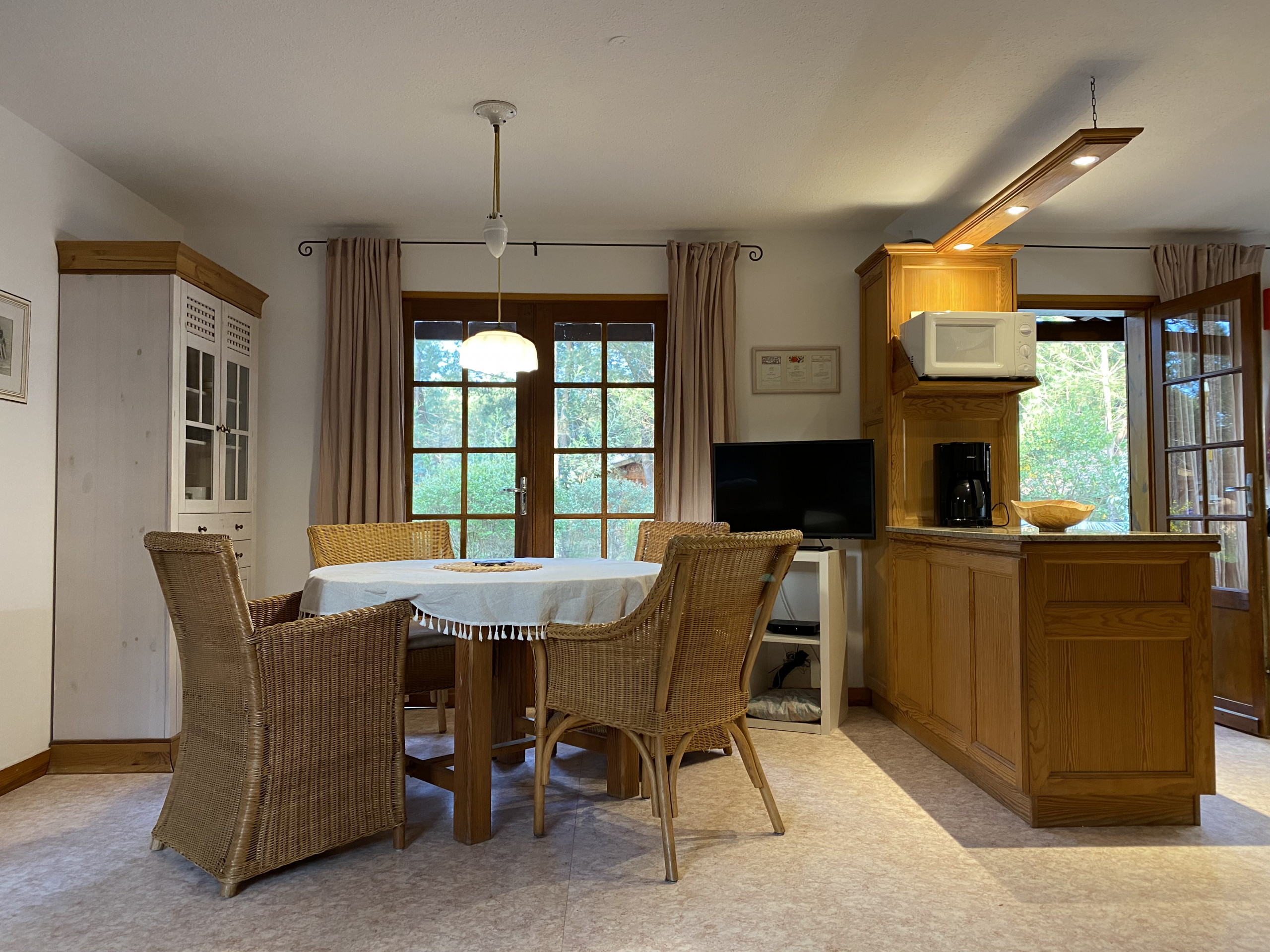 Wohnfläche ca. 48 qm. Wohnraum mit offenem Küchenbereich - Kühlschrank mit 4-Sterne-Gefrierfach, Herd mit Ceranfeld, Backofen, Dunstabzugshaube, Mikrowelle, Kaffeemaschine, Toaster, Spülmaschine, Waschmaschine. Im Wohnraum neues Sofa, TV, Stereo-Anlage und gemütlicher Holzofen. Mückengitter und Fensterläden vor allen Fenstern. 2 Ventilatoren/Heizlüfter, Bügelbrett und Bügeleisen sind vorhanden. Badbereich – separate Toilette und bodentiefe Dusche. 3 Terrassen für unterschiedliche Sonnenstände und Witterungsverhältnisse – 1 überdachte Terrasse mit verglasten Schiebetüren, Holzbodenterrasse mit und ohne Überdachung, sowie Steinbodenterrasse im Gartenbereich.