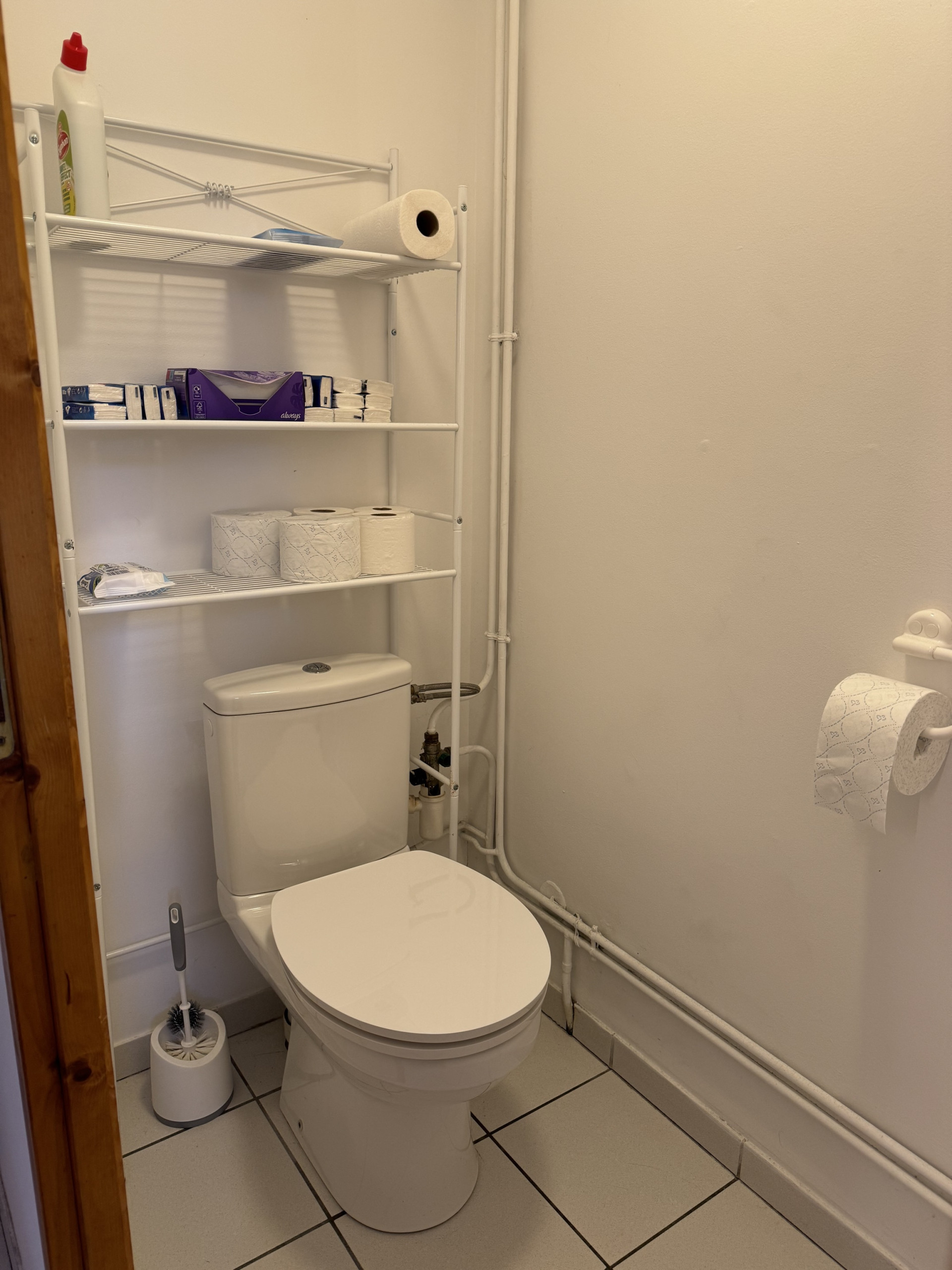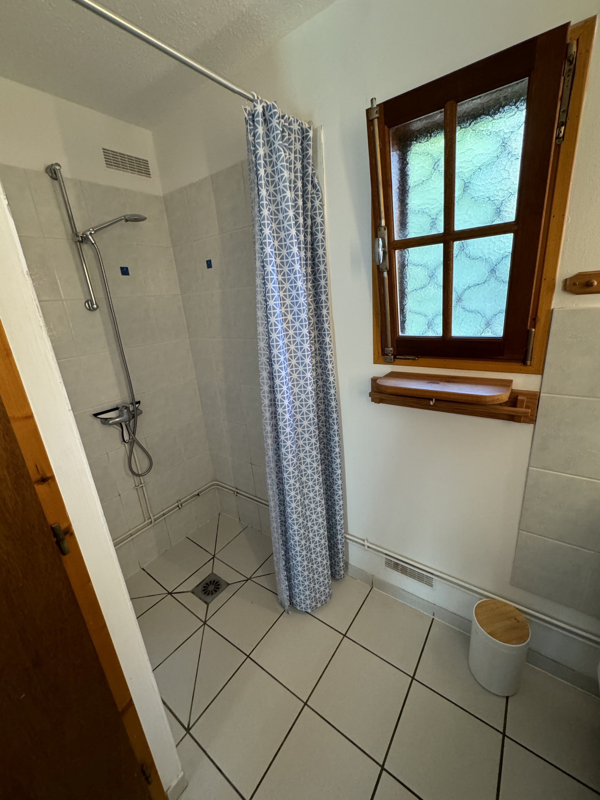 Von der Holzterrasse zugänglich ist der Abstellraum mit Stühlen, Stuhlkissen, Liegen, Liegenauflagen, Sonnenschirmen, Staubsauger, Wäscheständern und einem zusätzlichen großen Kühlschrank mit großem Gefrierfach. Carport, Aussendusche kalt/warm. 1 Doppelbett 160 x 200 cm, 2 Einzelbetten 80 x 200 cm.