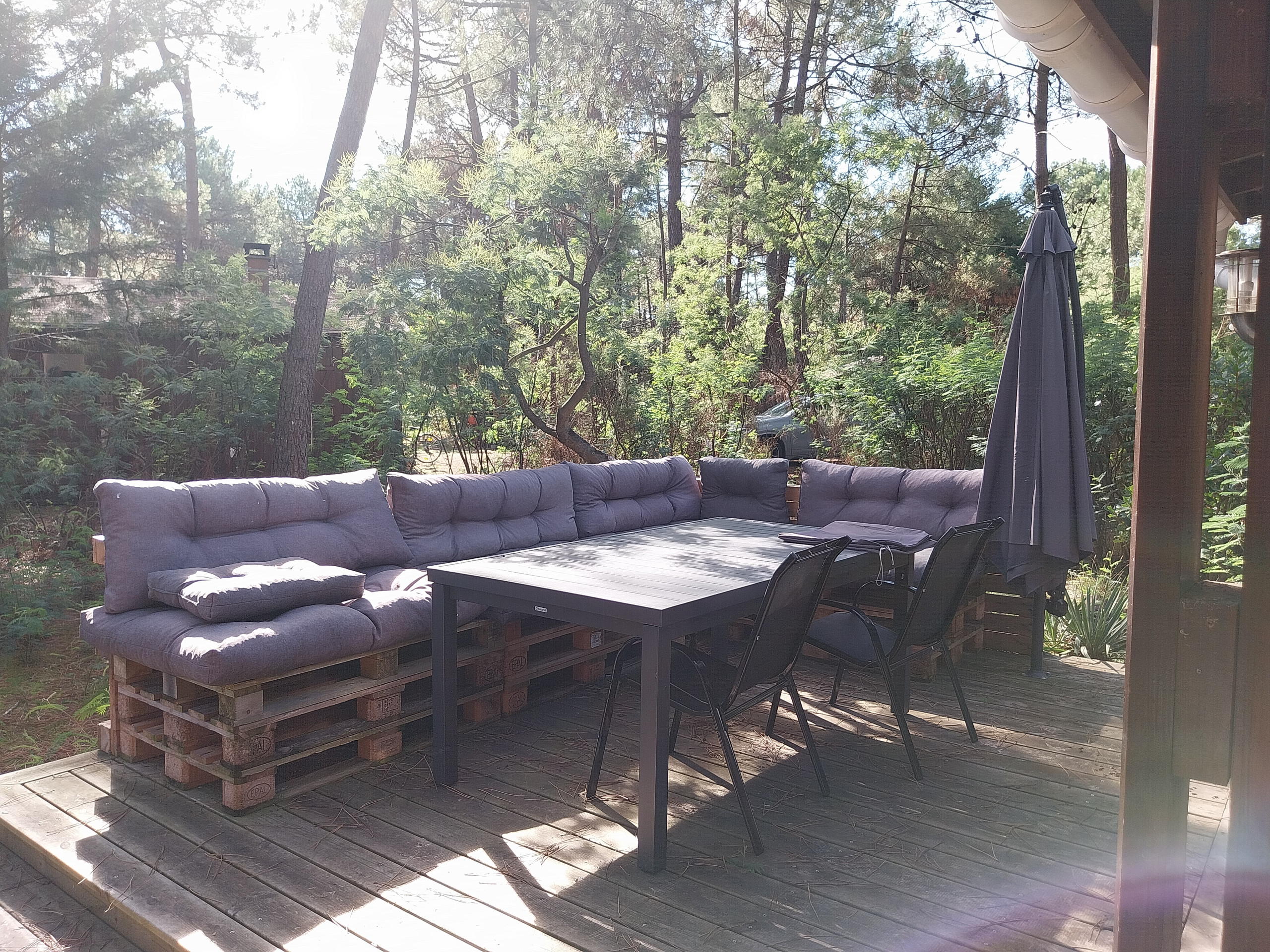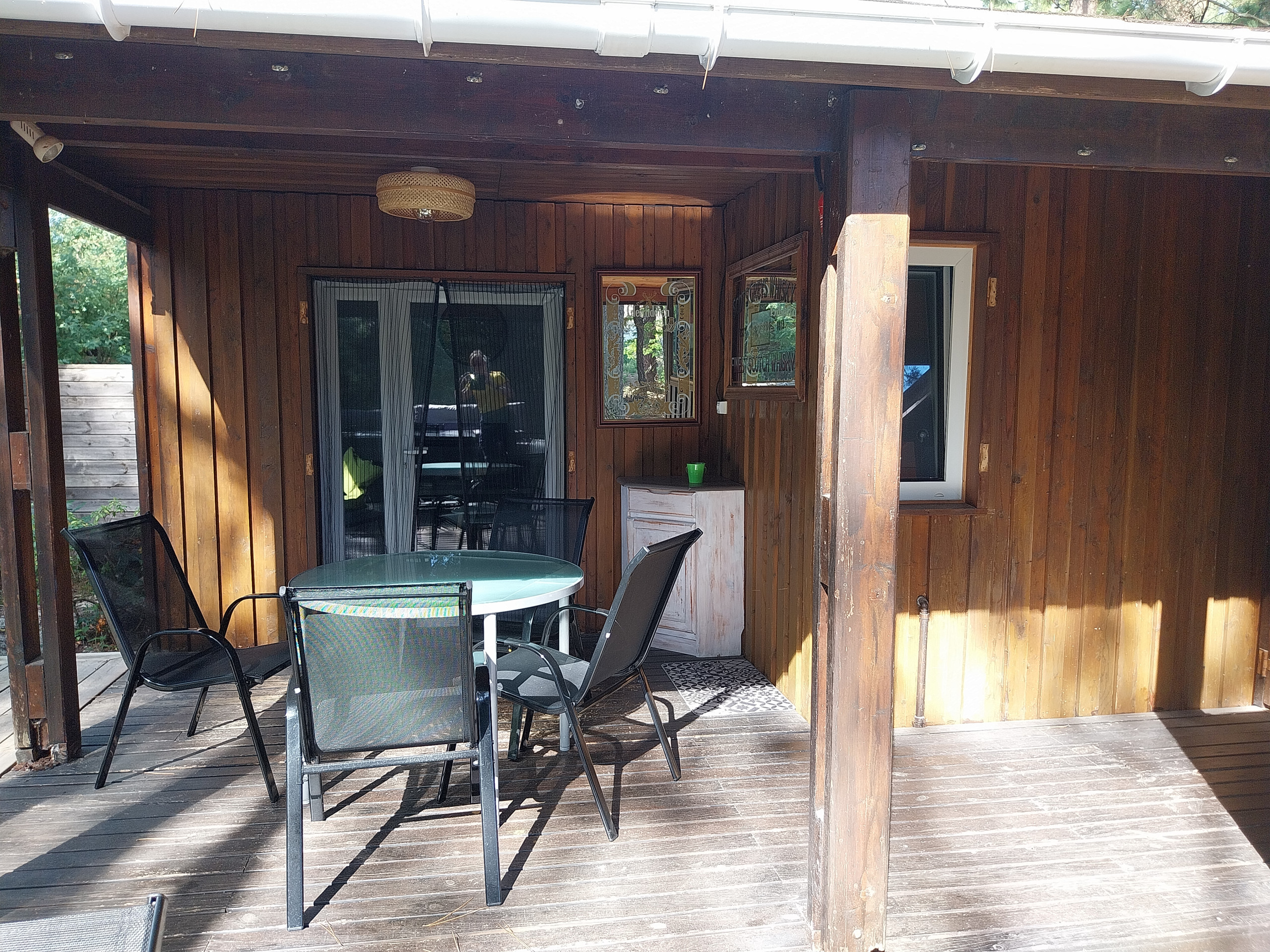 Die Türen und Fenster sind aus PVC und doppelt verglast. Auf der überdachten Terrasse befindet sich ein Schuppen mit Waschmaschine.
