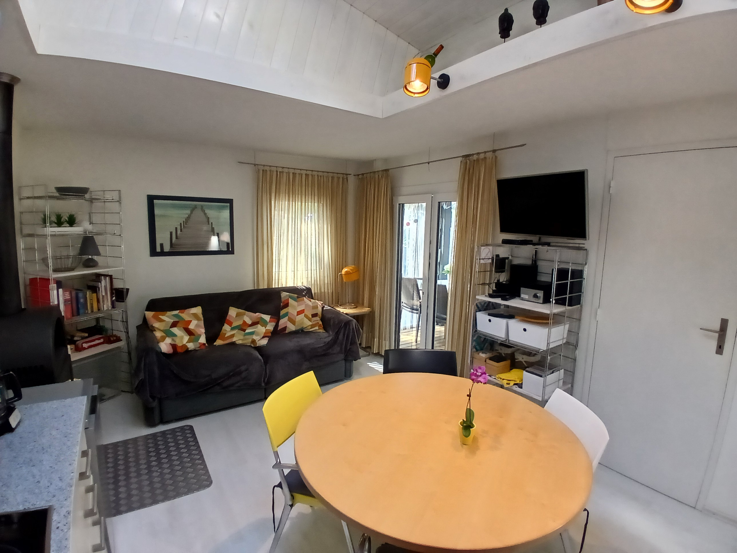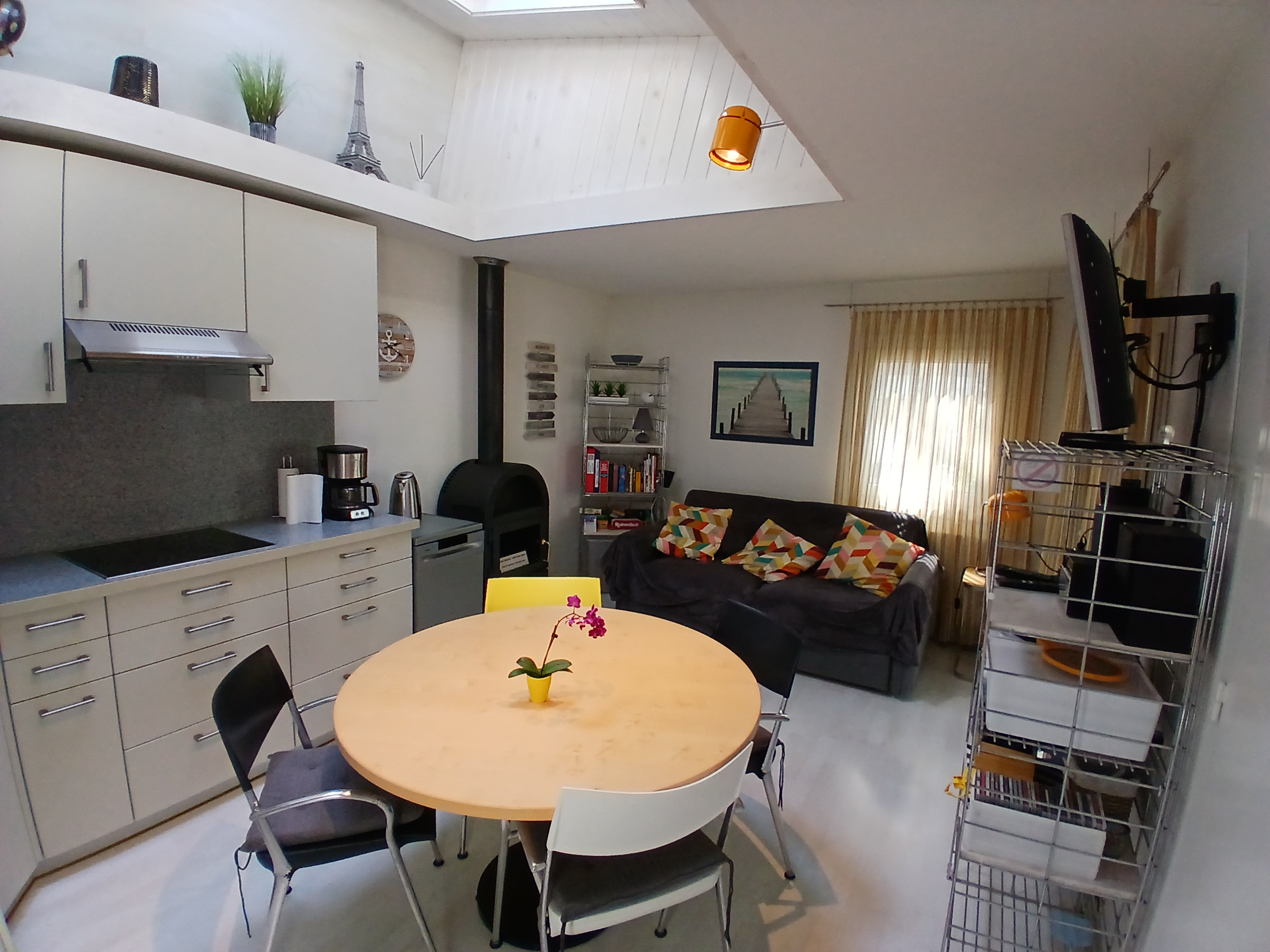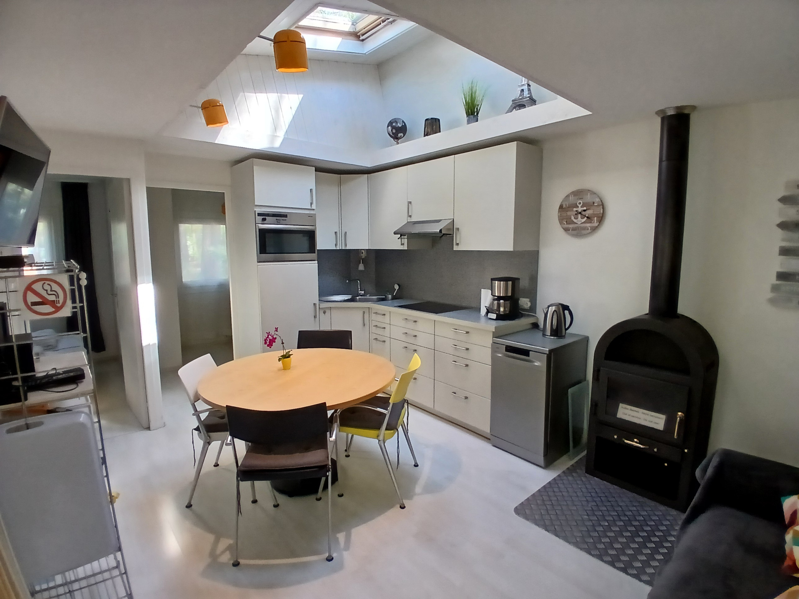 Großer Wohnraum mit herausgenommener Zwischendecke und Giebelfenster; durchgängiger Holzfußboden, integrierte und voll ausgestattete Küche mit dreiflammigem Induktions- und mit Backherd, Kaffeemaschinen (Pad, Bodum, Espresso, Filter). Ein größeres und ein kleineres Schlafzimmer mit super bequemen Auflagen (die abgenommen werden können); vergrößertes Bad mit leicht unterteiltem Dusch-, Toiletten- und Waschbeckenbereich. Terrasse mit gepflegtem, naturbelassenem Holzboden auf 25 m² erweitert, warme Außendusche, Holz-Gartenmöbel.