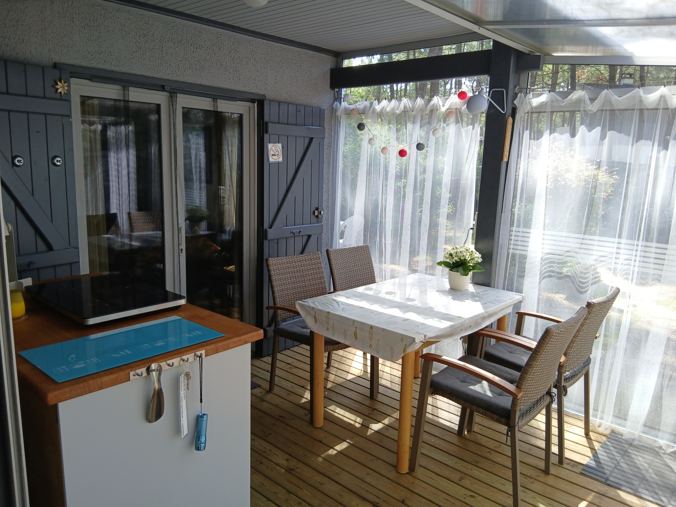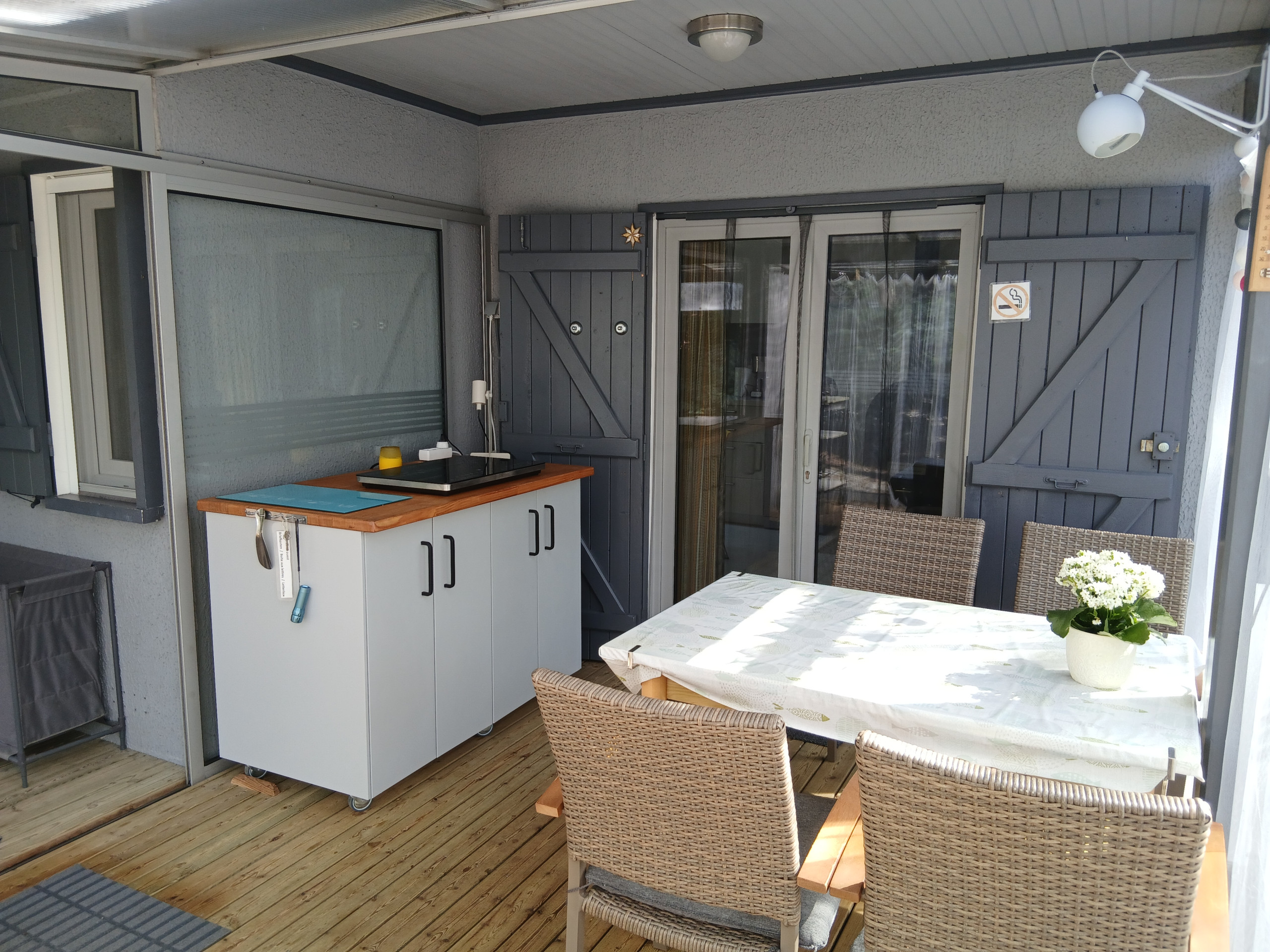 Die Verandaküche mit zwei Kochplatten können Sie für die Zubereitung kleinerer Mahlzeiten nutzen, eine zweite Essgruppe ist hier vorhanden.