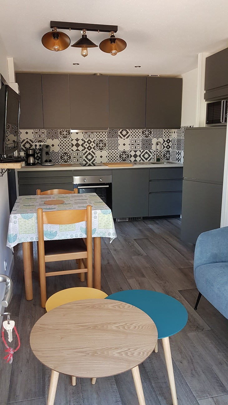 Sehr schönes, renoviertes und gepflegtes Studio mit moderner Einrichtung und grosser, sonniger Terrasse mit schönem Garten. Sie verfügen über eine Waschmaschine und eine warme Aussendusche. 2 Fenstertüren sorgen für Sonne bis zum Abend. Fahrradunterstand. 1 Doppelbett 140x190.