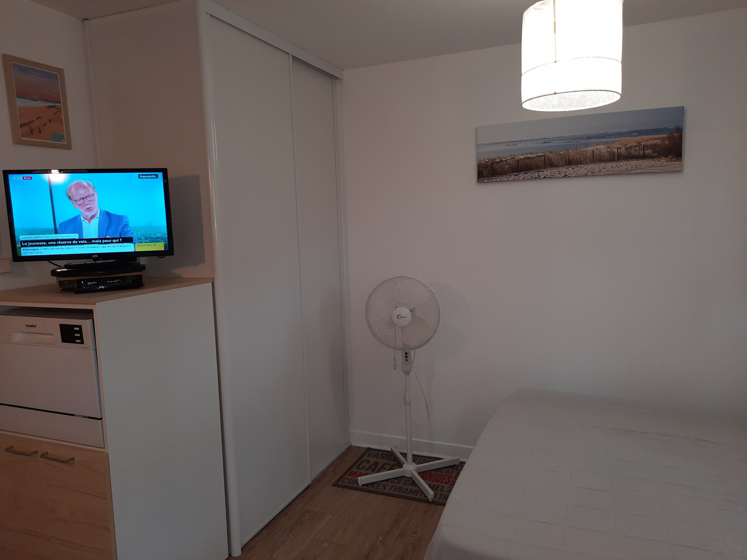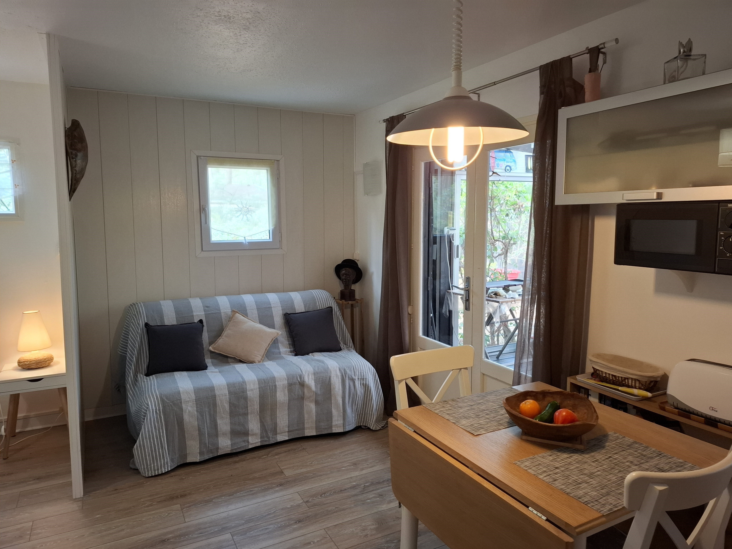 Schönes renoviertes Studio auf sehr grossem Grundstück ohne vis-à-vis im Dorf Asien. Der Schlafbereich mit einem Doppelbett von 140x200 ist durch eine Schiebewand abgetrennt.