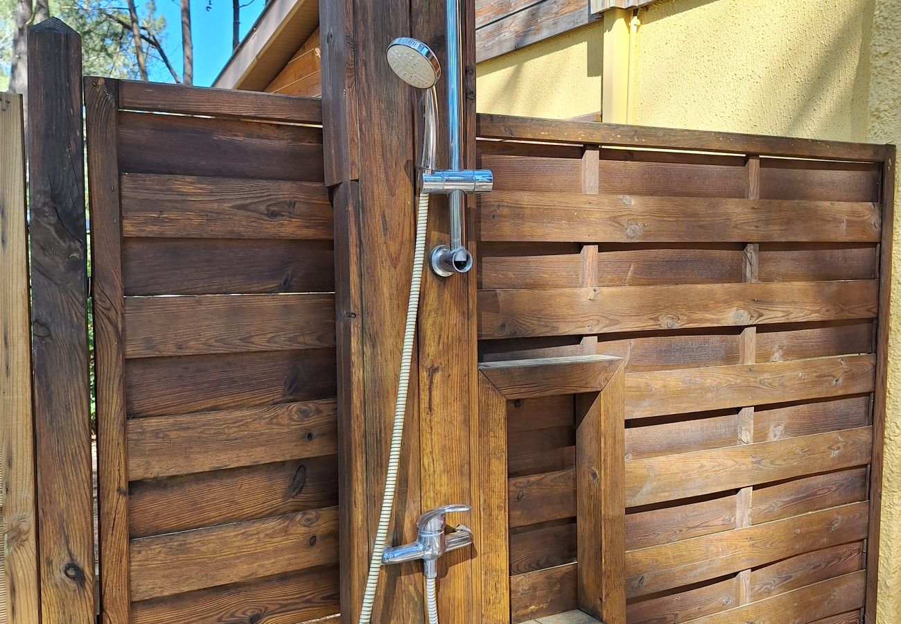 Neuer Boden, warme Außendusche, Internetzugang über Glasfaser und ein separates Schlafzimmer - ein voll ausgestattetes Studio für einen angenehmen Aufenthalt mit der Familie.