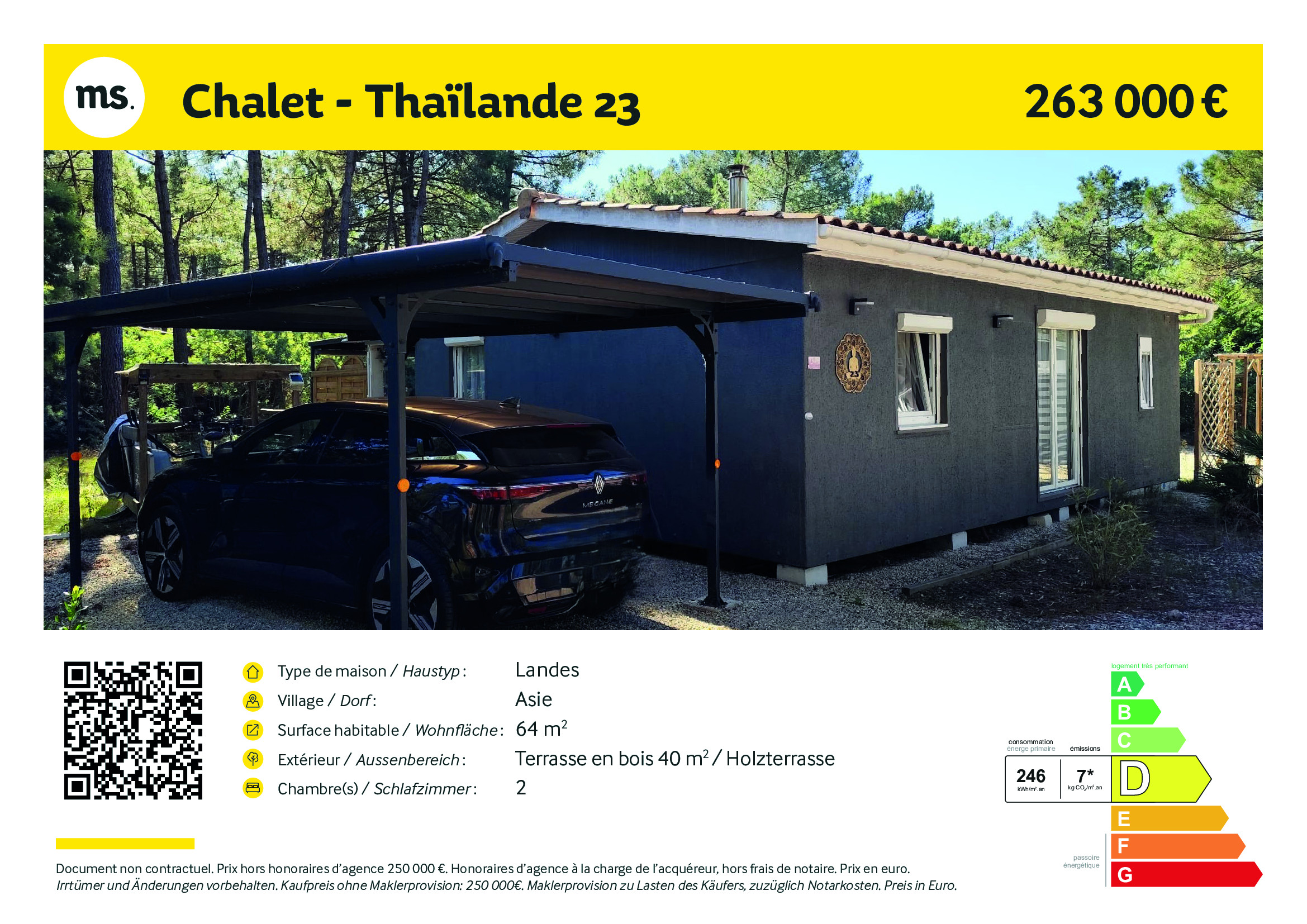 Chalet "ready to live" in the heart of the Asian village on a beautiful location and situated in a peaceful neighbourhood. The accommodation has been completely renovated during the years 2022-2023. You have 2 beautiful living rooms, a fully equipped kitchen (dishwasher, oven, microwave, induction hobs, large fridge, freezer) and 2 bedrooms, one of which is currently fitted out as an office and sofa bed, and the other has a large walk-in wardrobe. The interior walls have been lined, the PVC tilt-and-turn windows and doors, and the sliding bay window in aluminium. The windows are fitted with electric roller shutters. The bedrooms are equipped with low-consumption electric heating, the living room and lounge have reversible air conditioning (with 2 splits).