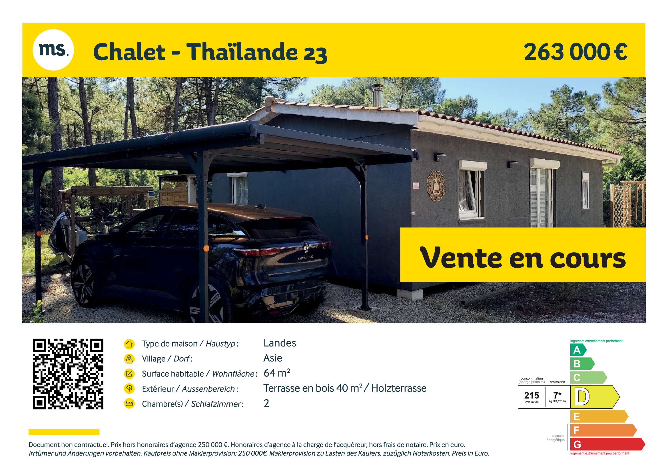 SALE IN PROGRESS - Chalet "ready to live" in the heart of the Asian village on a beautiful location and situated in a peaceful neighbourhood. The accommodation has been completely renovated during the years 2022-2023. You have 2 beautiful living rooms, a fully equipped kitchen (dishwasher, oven, microwave, induction hobs, large fridge, freezer) and 2 bedrooms, one of which is currently fitted out as an office and sofa bed, and the other has a large walk-in wardrobe. The interior walls have been lined, the PVC tilt-and-turn windows and doors, and the sliding bay window in aluminium. The windows are fitted with electric roller shutters. The bedrooms are equipped with low-consumption electric heating, the living room and lounge have reversible air conditioning (with 2 splits).