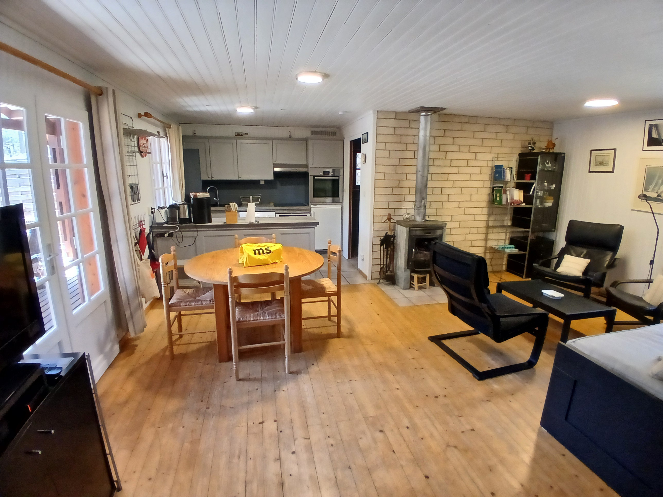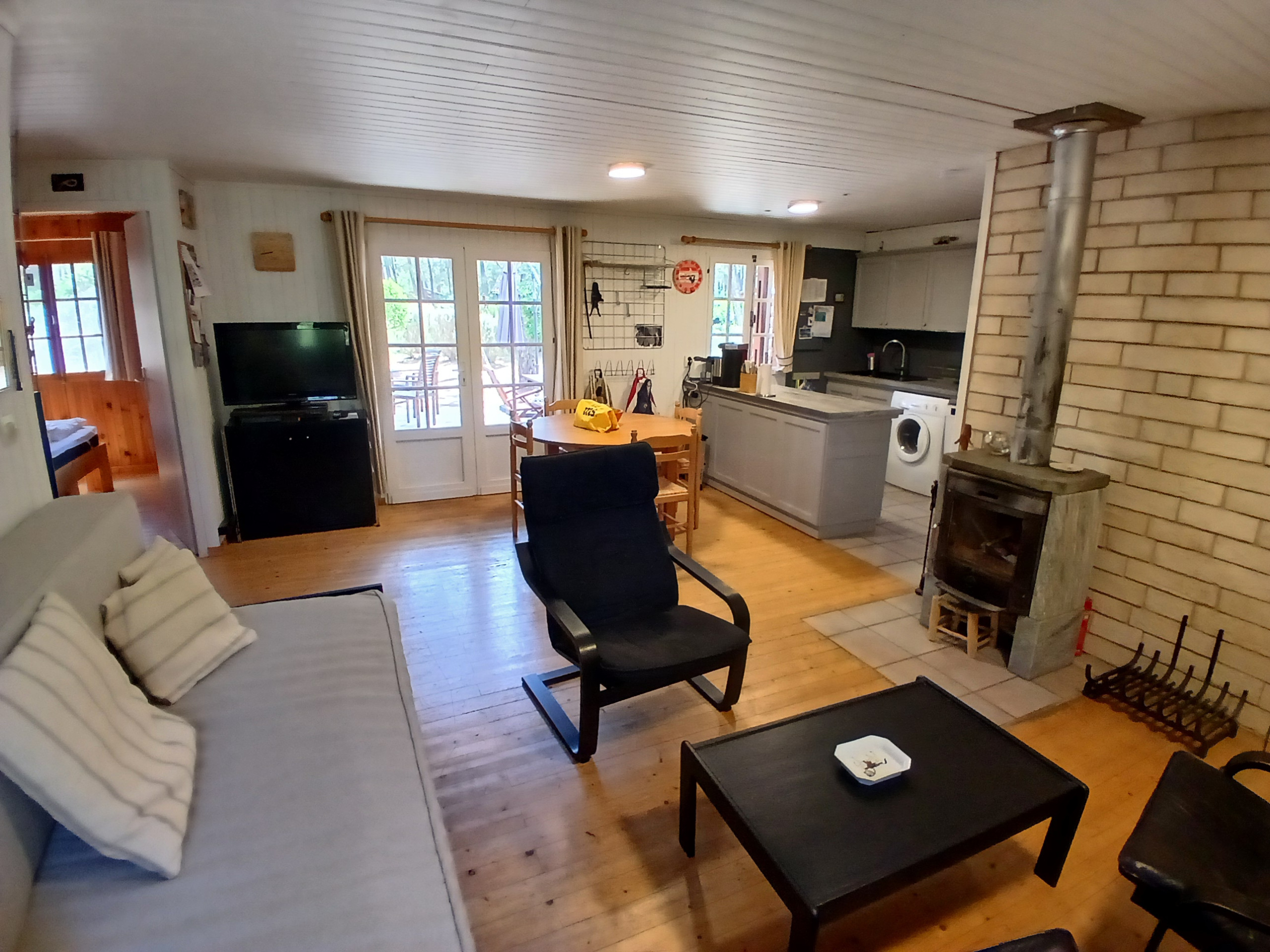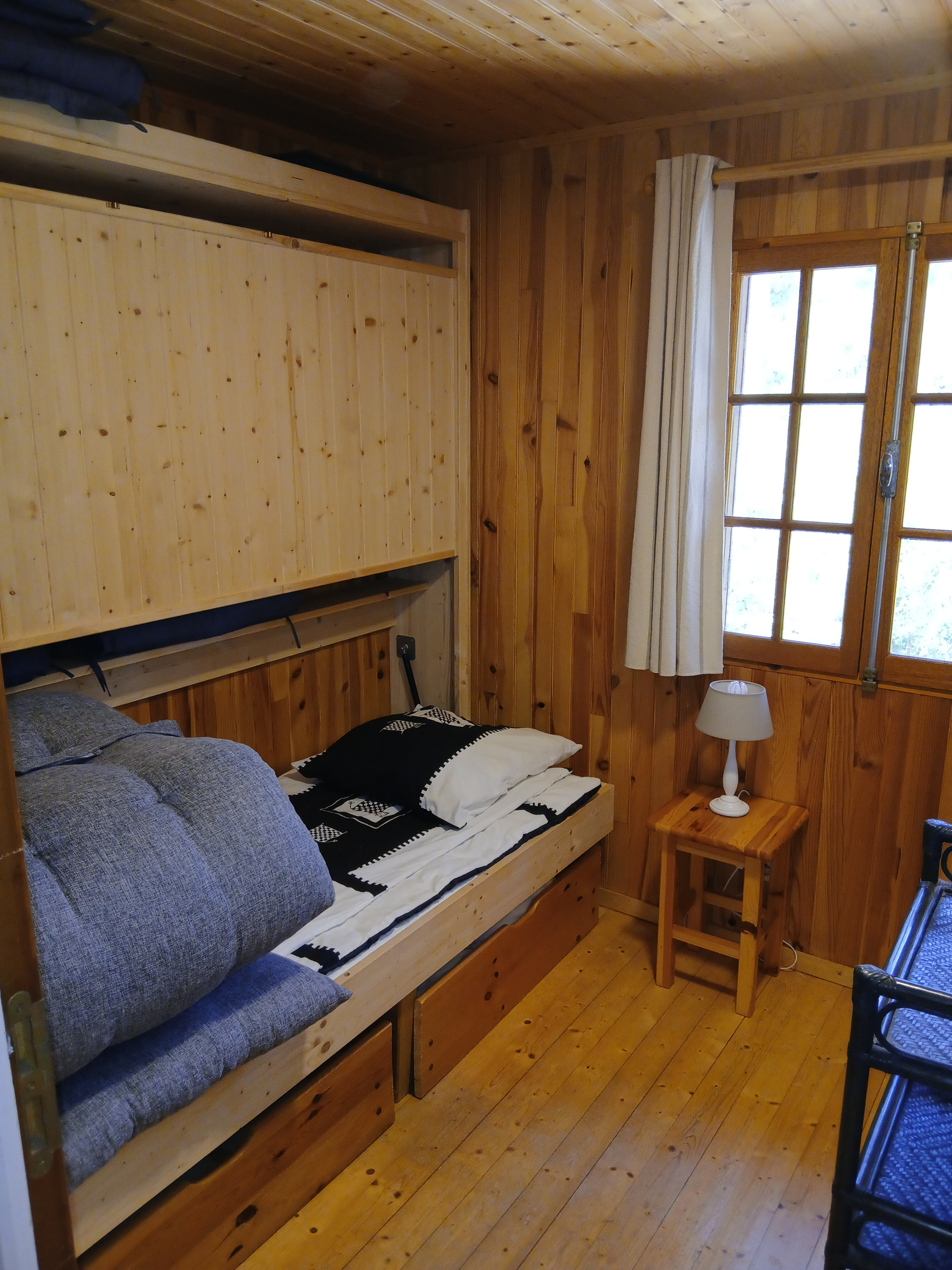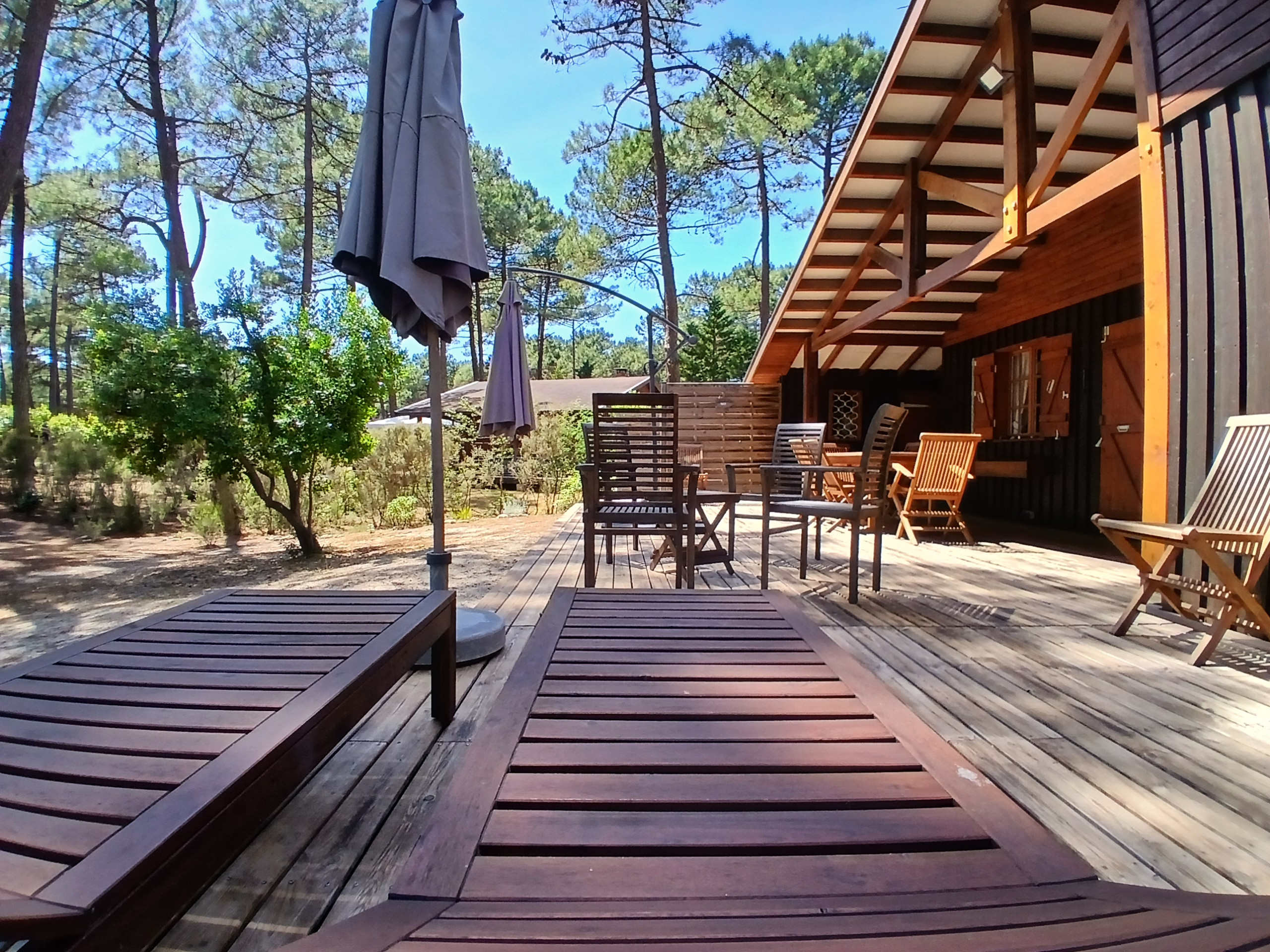Chalet individuel où il fait bon vivre… Equipement soigné : lave-linge, lave-vaisselle, micro-ondes, douche extérieure chaude, grande terrasse, abri-vélos. Cuisine toute équipée donnant sur le séjour, WC et salle de bain séparés. 1 lit double 140x200, 1 lit superposé 2x80x200, 1 lit simple 80x200.