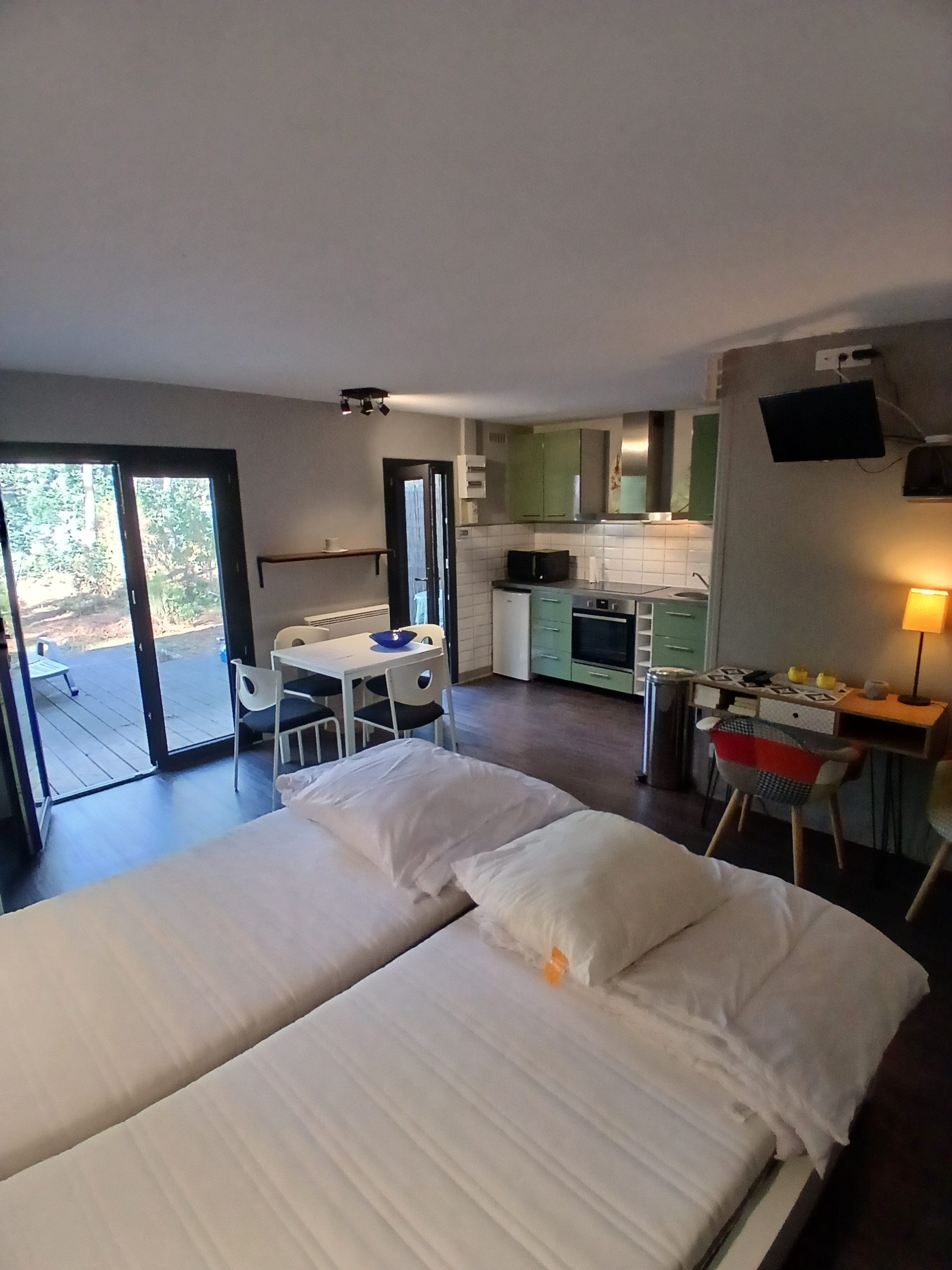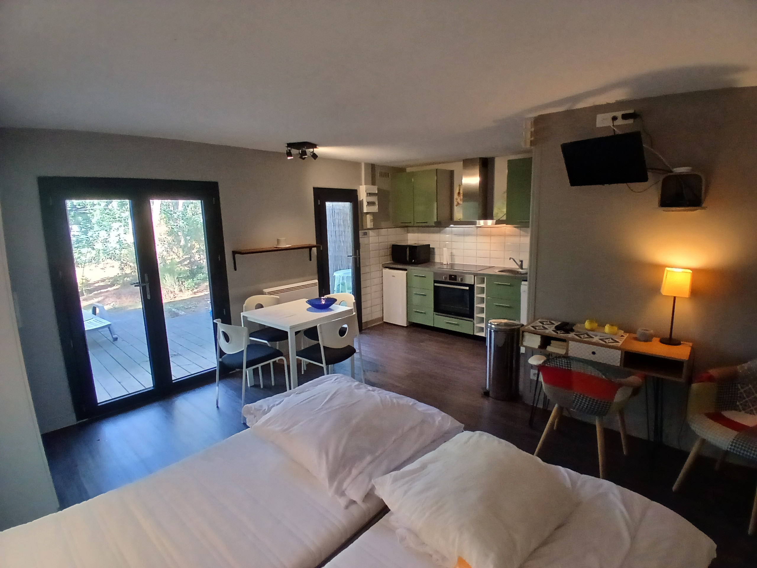 Studio entièrement rénové et décoré avec soin. Très bien exposé et ensoleillé, vous disposez d'une terrasse agrandie de 35m² pour vos moments de détente et d'une douche extérieure froide/chaude. A l'intérieur la décoration est chaleureuse et agréable, tout équipé en neuf avec dans la cuisine une plaque induction, un four, un micro-onde, un lave-vaisselle, un frigo, 2 cafetières (filtre et Senséo) etc...Dans l'espace nuit un grand lit de 180x200 (2 matelas de 90) avec tiroirs de rangement, une télé/radio, une grande penderie, un coin cocooning...et dans la salle de bain un porte serviette chauffant. Dans le cagibi extérieur, un BBQ et un 2nd frigo. Bref, un studio pour de belles vacances…