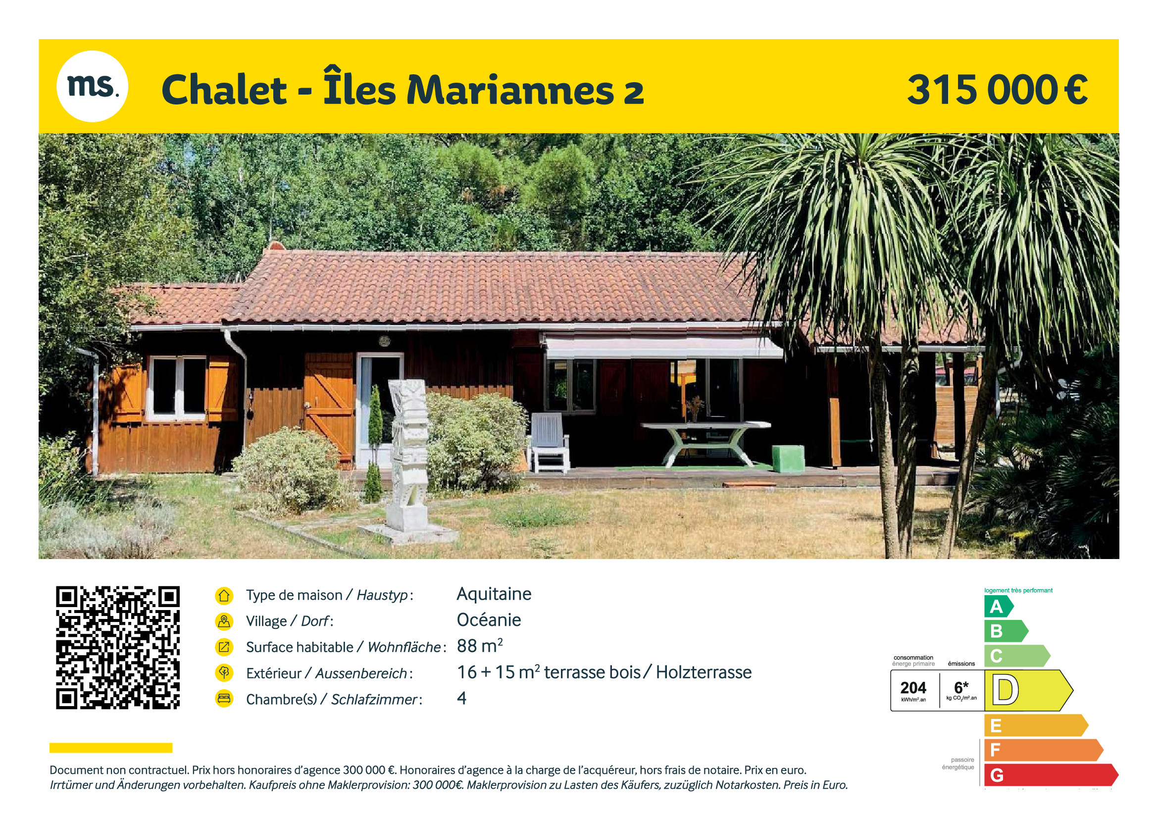 BAISSE DE PRIX! Chalet "Aquitaine" situé dans le paisible quartier Océanie. Construit en 2007 sur dalle béton réhaussée. Le bien dispose de 3 chambres et d'un dressing aménagé. Chaque pièce est équipée d'un convecteur électrique et d'huisseries PVC double vitrage. Une isolation complémentaire en combles permet de profiter du chalet tout au long de l'année. Le chalet est vendu meublé. La terrasse rénovée en 2025, en bois exotique, orientée sud, équipée d'un store banne électrique, ainsi que la douche extérieure chaude sont une invitation à la détente. Le logement est équipé d'une prise téléphonique mais pas d'accès internet actuellement. A l'arrière du chalet, vous disposez d'un cellier de 10m2 carrelé et isolé, accessible par la porte de cuisine, en restant au sec, en cas de pluie, par l'avancée couverte. Un abri vélos complète l'ensemble de ce chalet très confortable et lumineux. La peinture extérieure a été refaite en 2020.